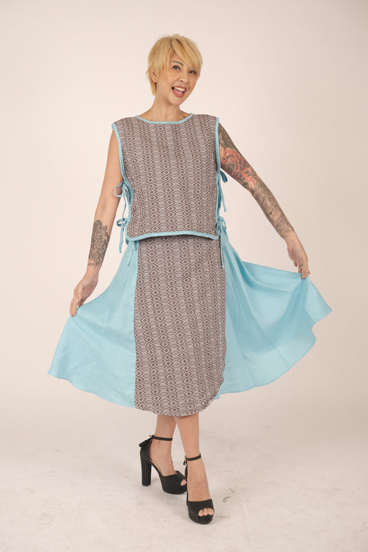 Sinan-Init Bib Vest and Wrap Skirt Pair in Inabel weave and Linen
