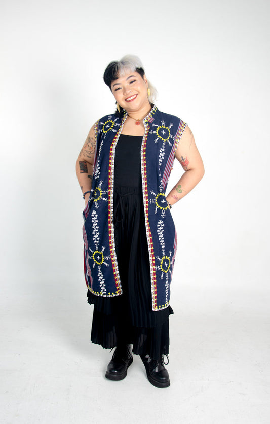 Kantarines Sleeveless Coat with Itneg Embroidery (Navy and Red Stripes)