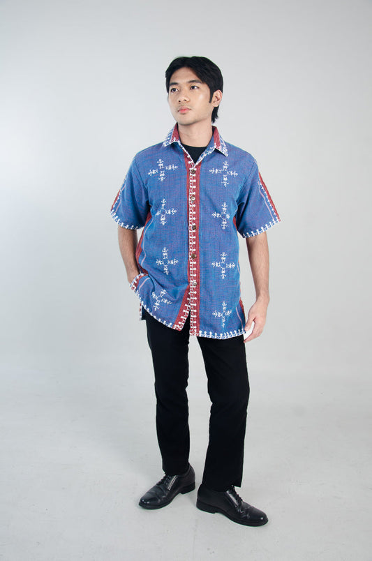 Kantarines Men's Button Down Polo with Itneg Embroidery (Navy Blue with Red Stripes)