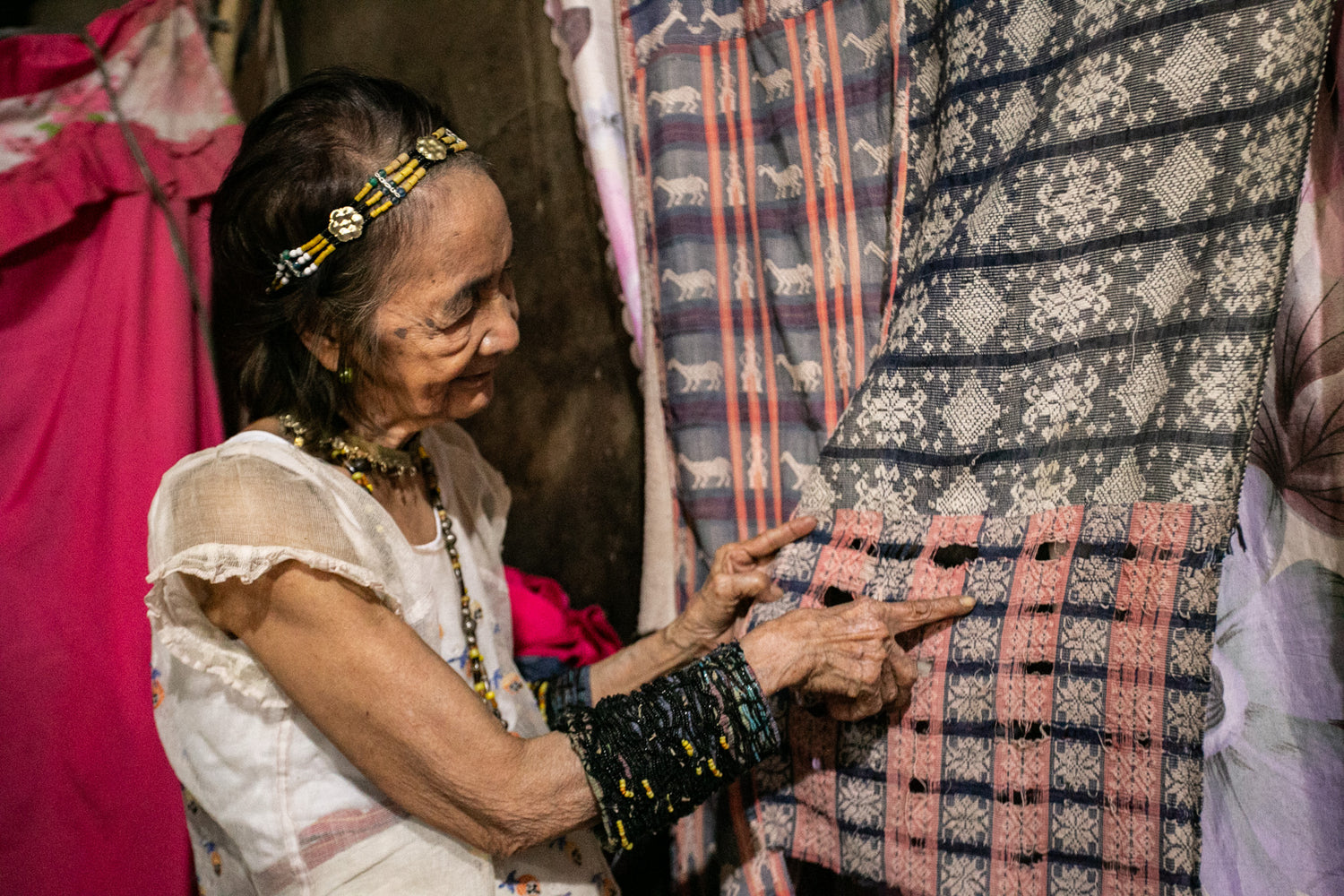 Photo (L): Itneg cultural elder Norma Agaid Mina points to the early designs of the pinilian-brocade weave from Abra. Photo Credit: Chantal Eco