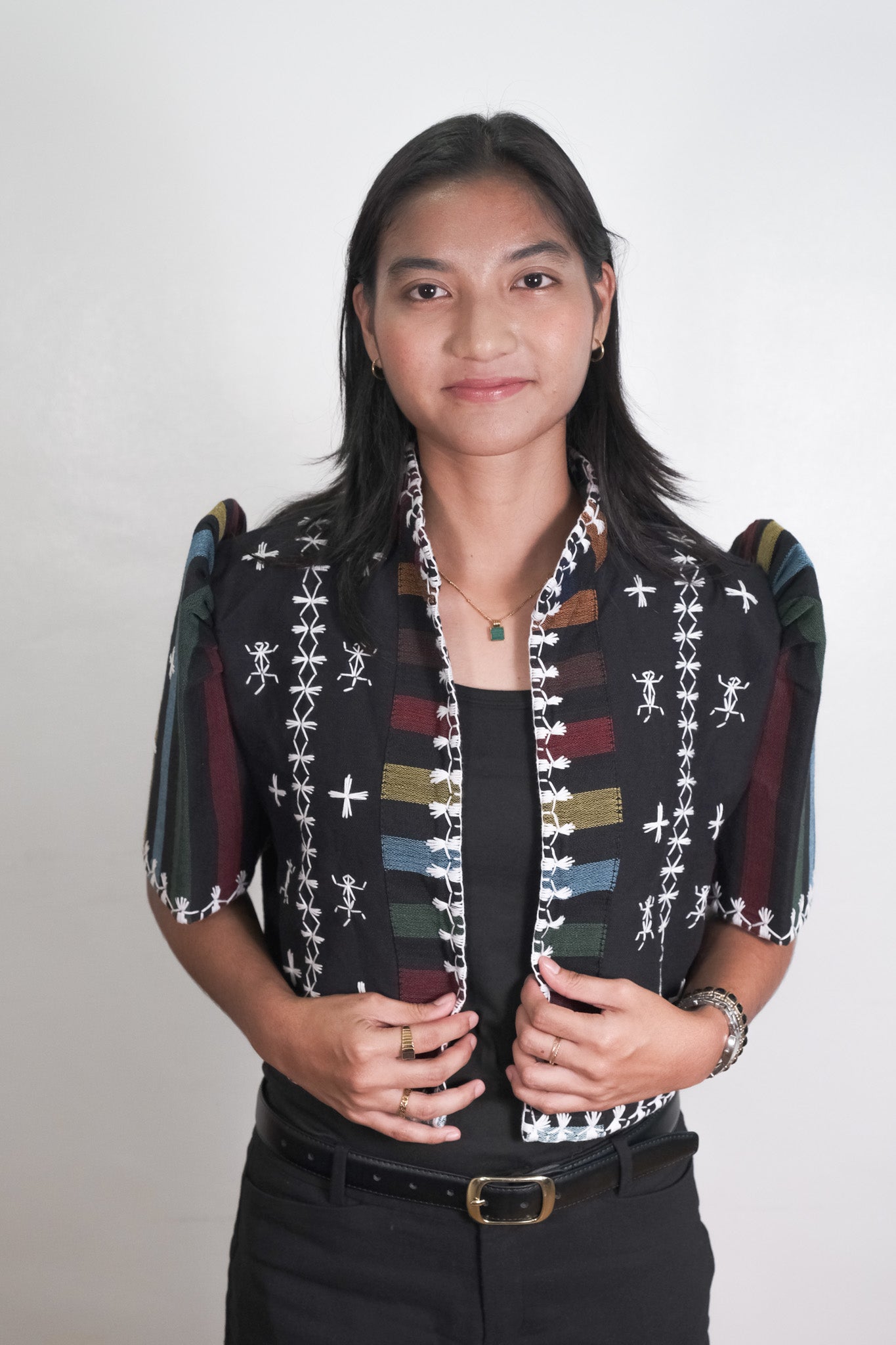 Fun and stylish kantarines bolero with rainbow color hues of blue, green, yellow, red and brown mixed with black kantarines weave. Accented with white Itneg embroidery and mandarin collar.