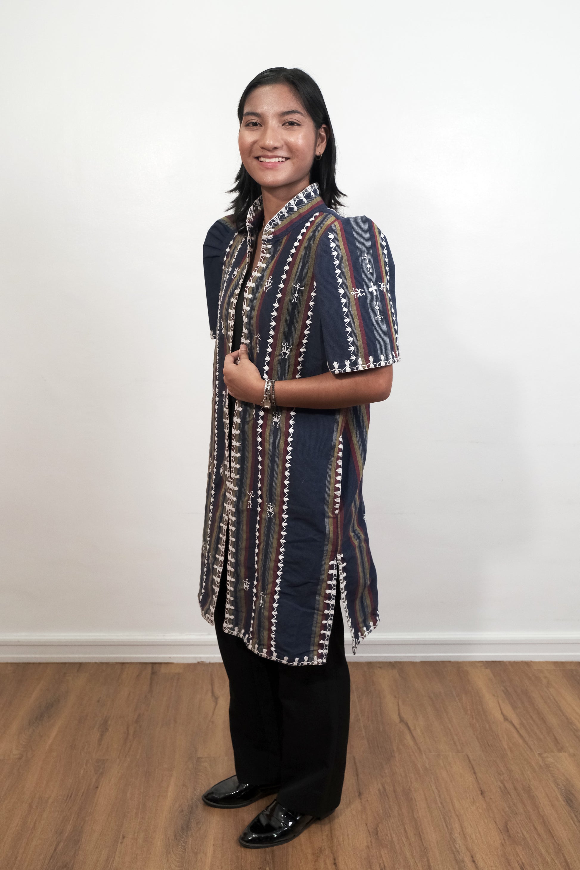 Kantarines Long Filipiniana with Itneg Embroidery (Navy Blue Stripes)